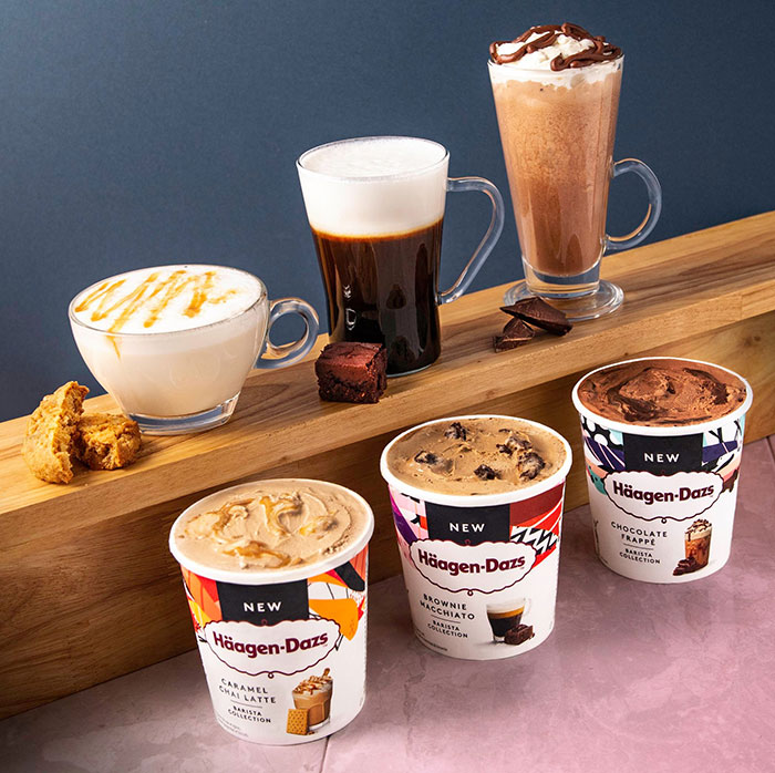 Häagen-Dazs presenta la gama de helados Barista Collection pensando en los amantes del café, el té y el chocolate. La línea, que ensalza el papel innovador de la marca dentro del sector, incluye tres nuevos sabores: Brownie Machiato, Caramel Chai Latte y Chocolate Frappé.