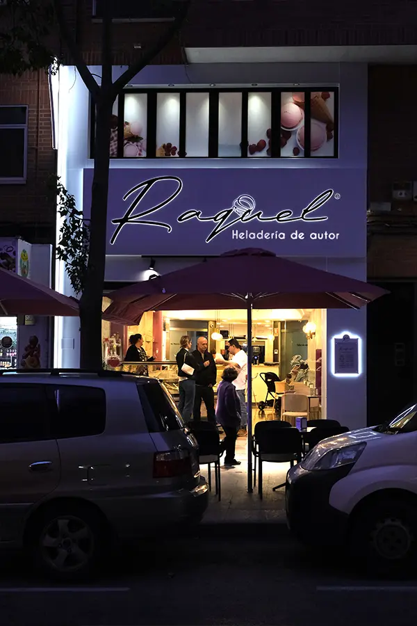 Desde su apertura en 2013, Raquel de Elche no es una heladería al uso. Cuando Marcos Elías se quedó el traspaso de una pastelería de toda la vida, decidió aprovechar esta herencia pastelera para ofrecer en este establecimiento toda clase de postres y pasteles helados.
